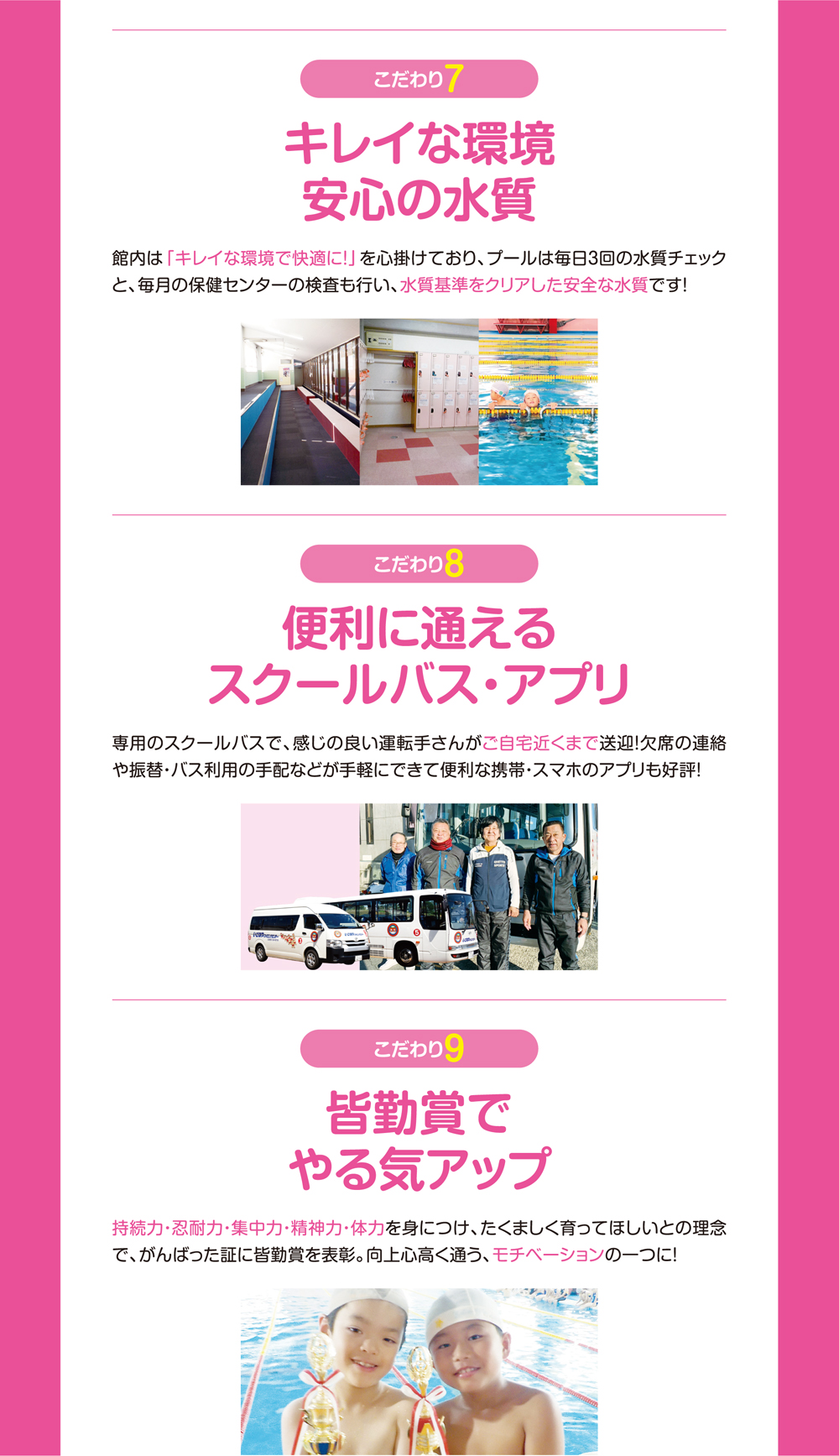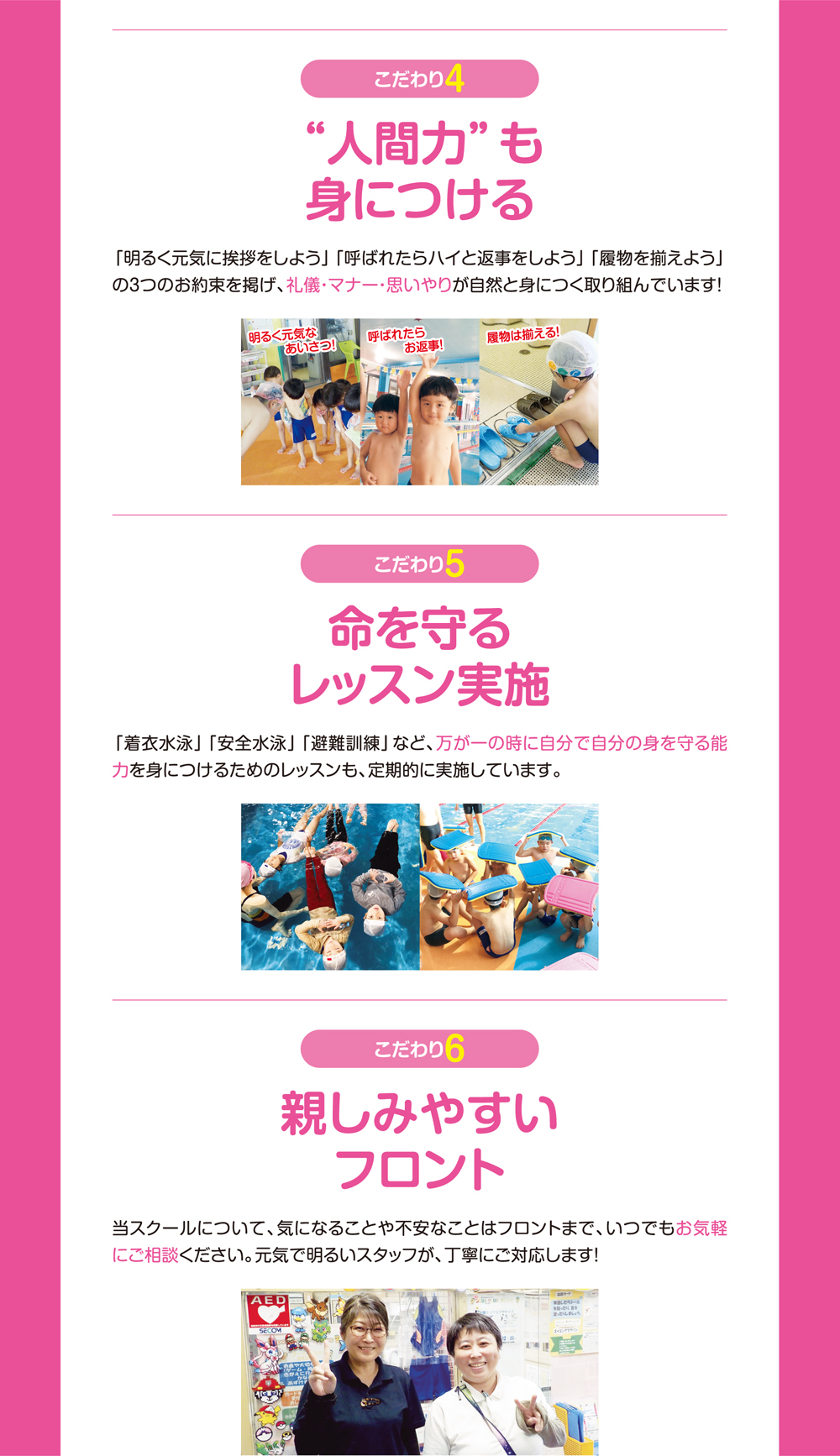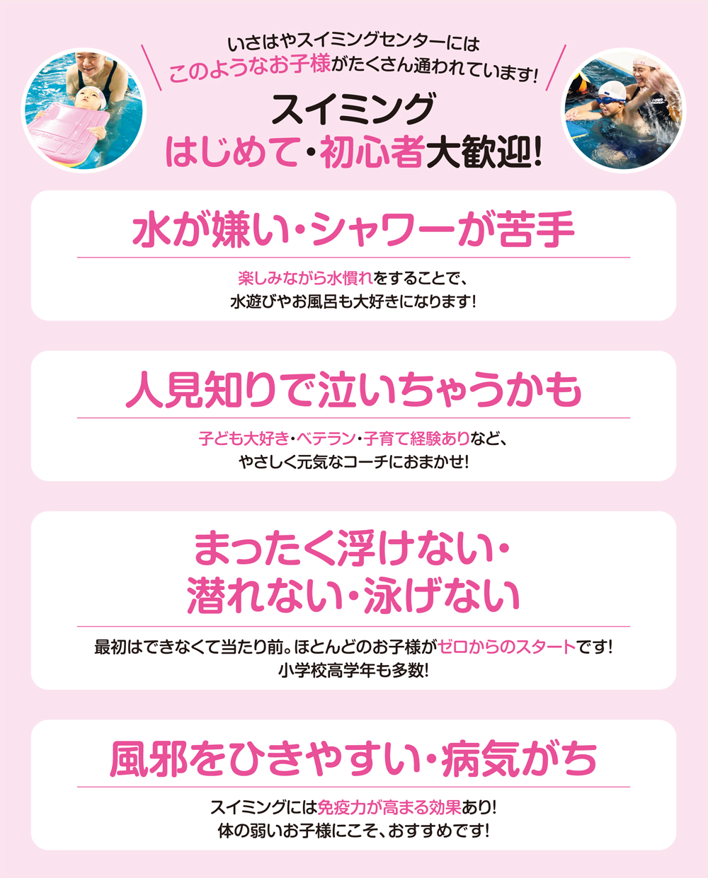 スイミングスクールは、「プールに入るのが苦手、顔付けができない、泳げない子」が練習するところです。